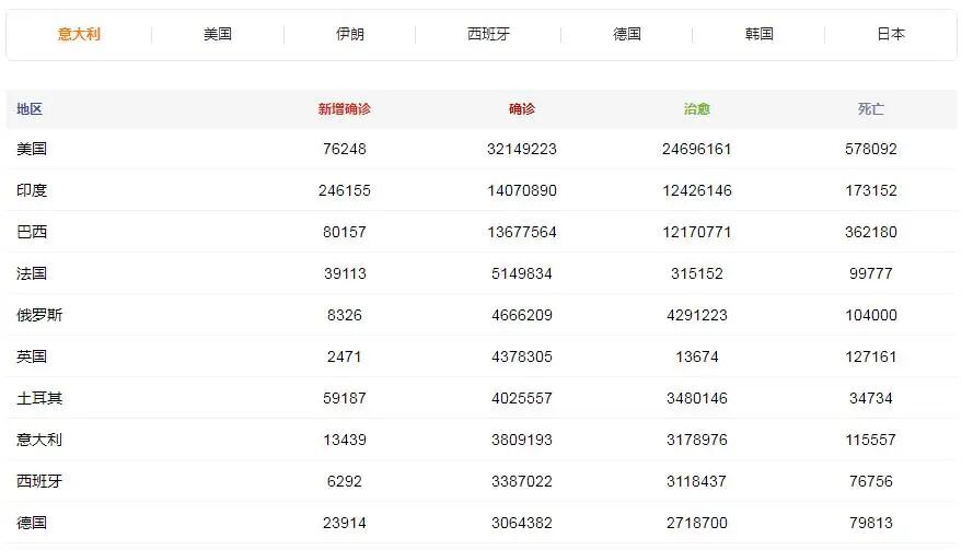 针对OPEC上调全球石油需求预期,这得益于现如今对疫情的控制得当及对疫情封锁措施的放松。当然,尽管如此,并不代表所有国家的疫情开始好转,据“中央社”报道,欧洲地区新冠疫情12日跨越黑暗里程碑,累计死亡人数超过100万。世界卫生组织警告称,尽管各界为遏止疫情蔓延付出巨大努力,但感染人数仍呈指数级增长。另外,从全球疫情部分数据(如下图)可知,印度及欧洲其他国家的疫情形式仍旧严峻,而近日美国也叫停了强生公司的疫苗,引得大家对疫苗的抵触,疫情出现反复,需求出现反弹,因此,面对如今现状,这些国家的油价走势仍然有许多的不确定性。